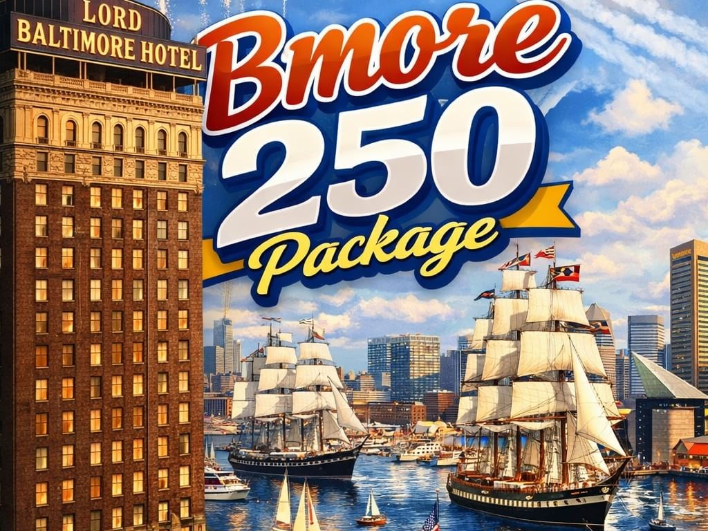 The "Bmore250 Package" includes overnight accommodations, complimentary valet parking, commemoritive item, early check in, and late check out.